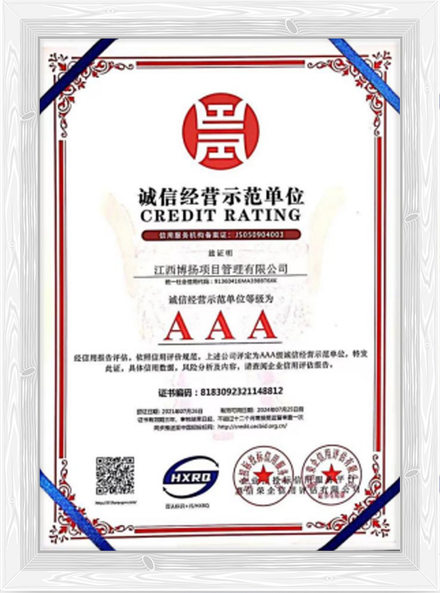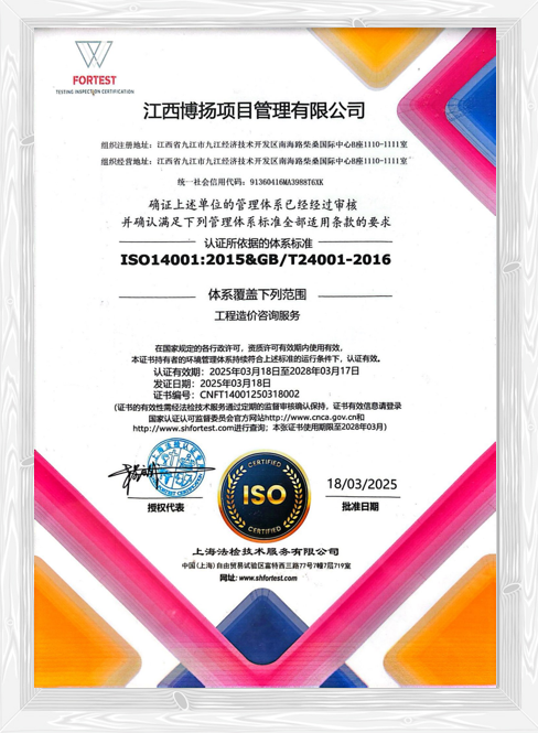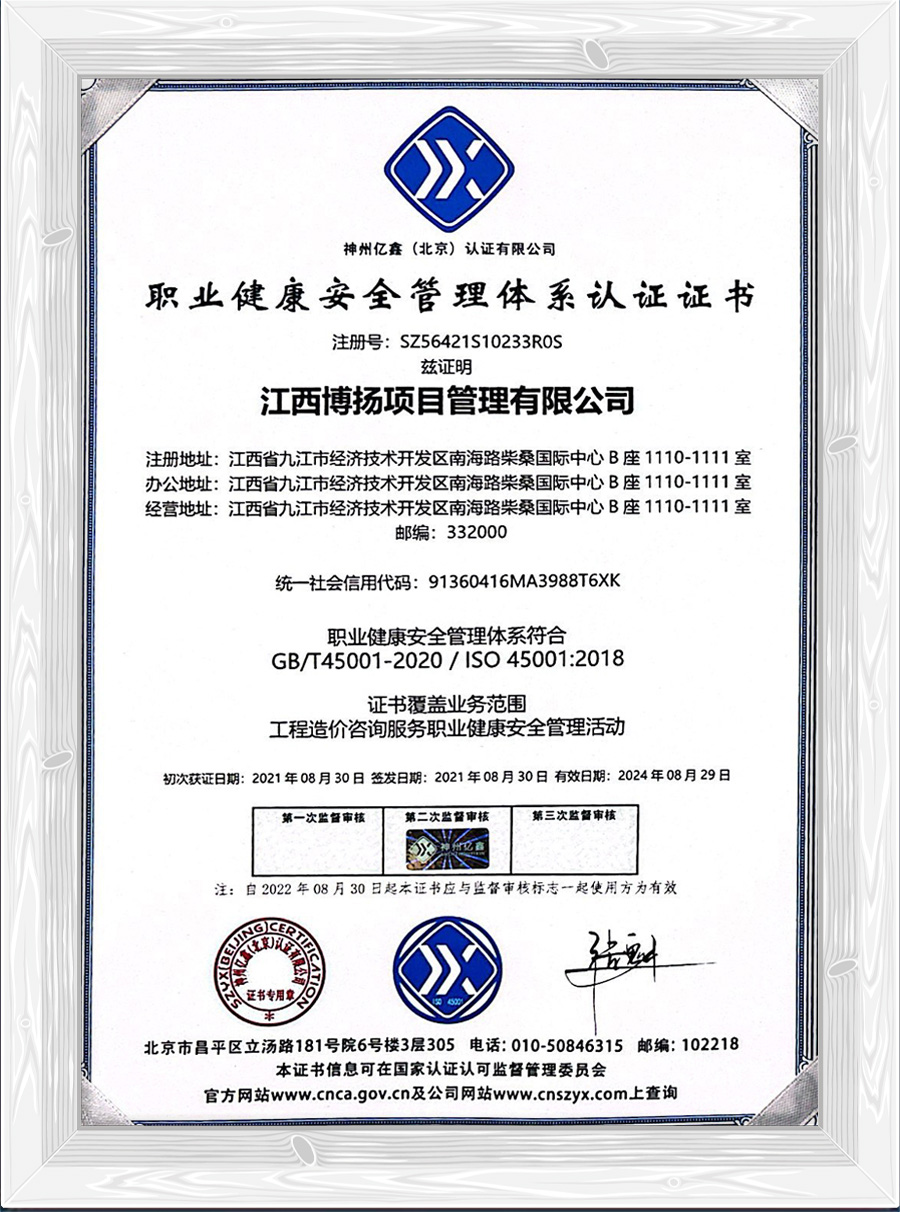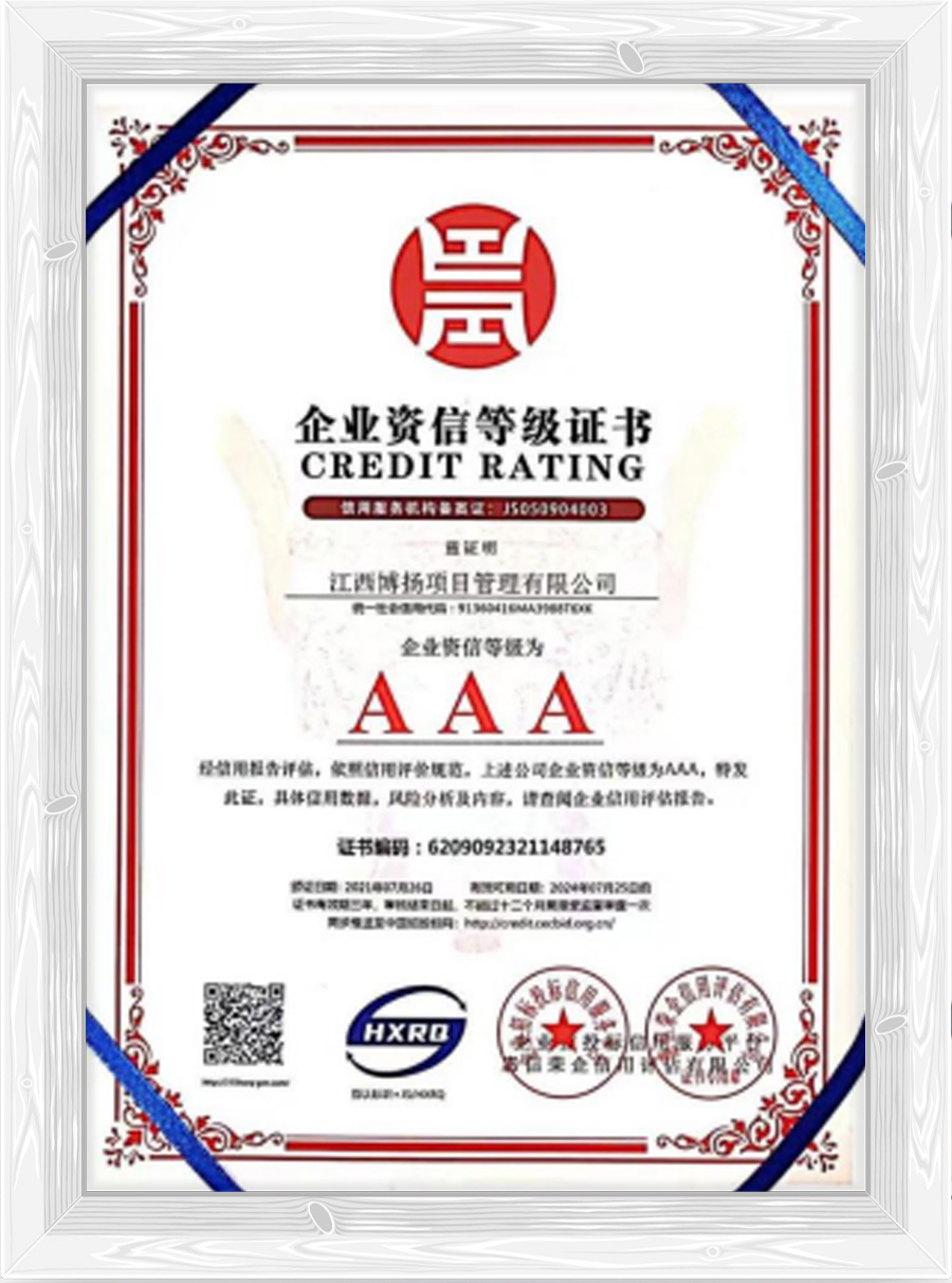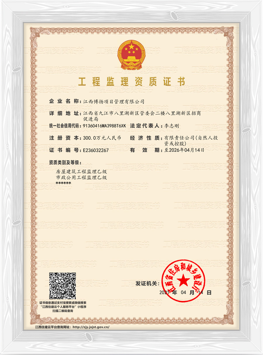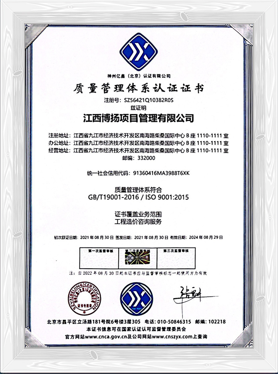 江西博扬项目管理有限公司成立于 2020 年 5 月,专门从事工程造价咨询、工程监理、招标代理、政府采购等业务的中介服务机构,业务上接受江西省建设厅,江西省建设工程造价管理站,江西省造价协会等部门的指导和监督。公司目前具备工程造价咨询乙级资质、房屋建筑及市政公用工程监理乙级资质;匹配了专业技术运用软件和硬件,同时建立了完善的组织架构和健全的管理制度体系,并获取了ISO三体系认证(质量管理体系认证、职业健康安全管理体系认证、环境管理体系认证)。