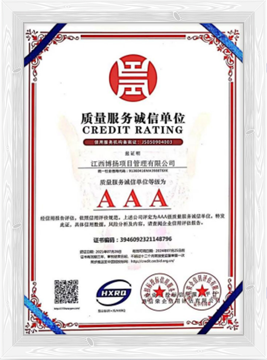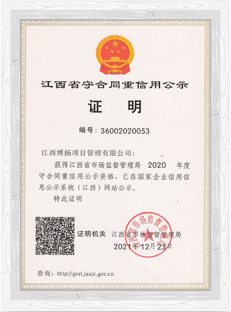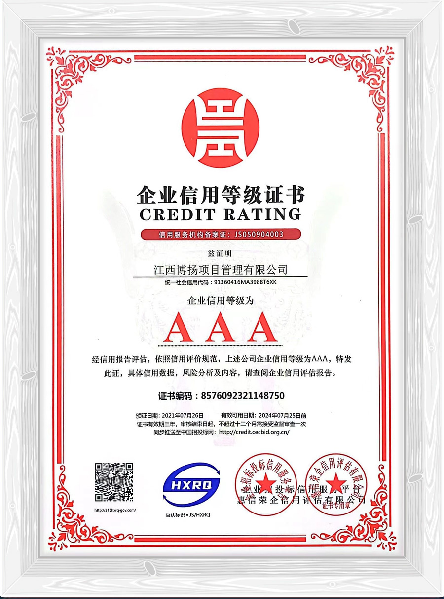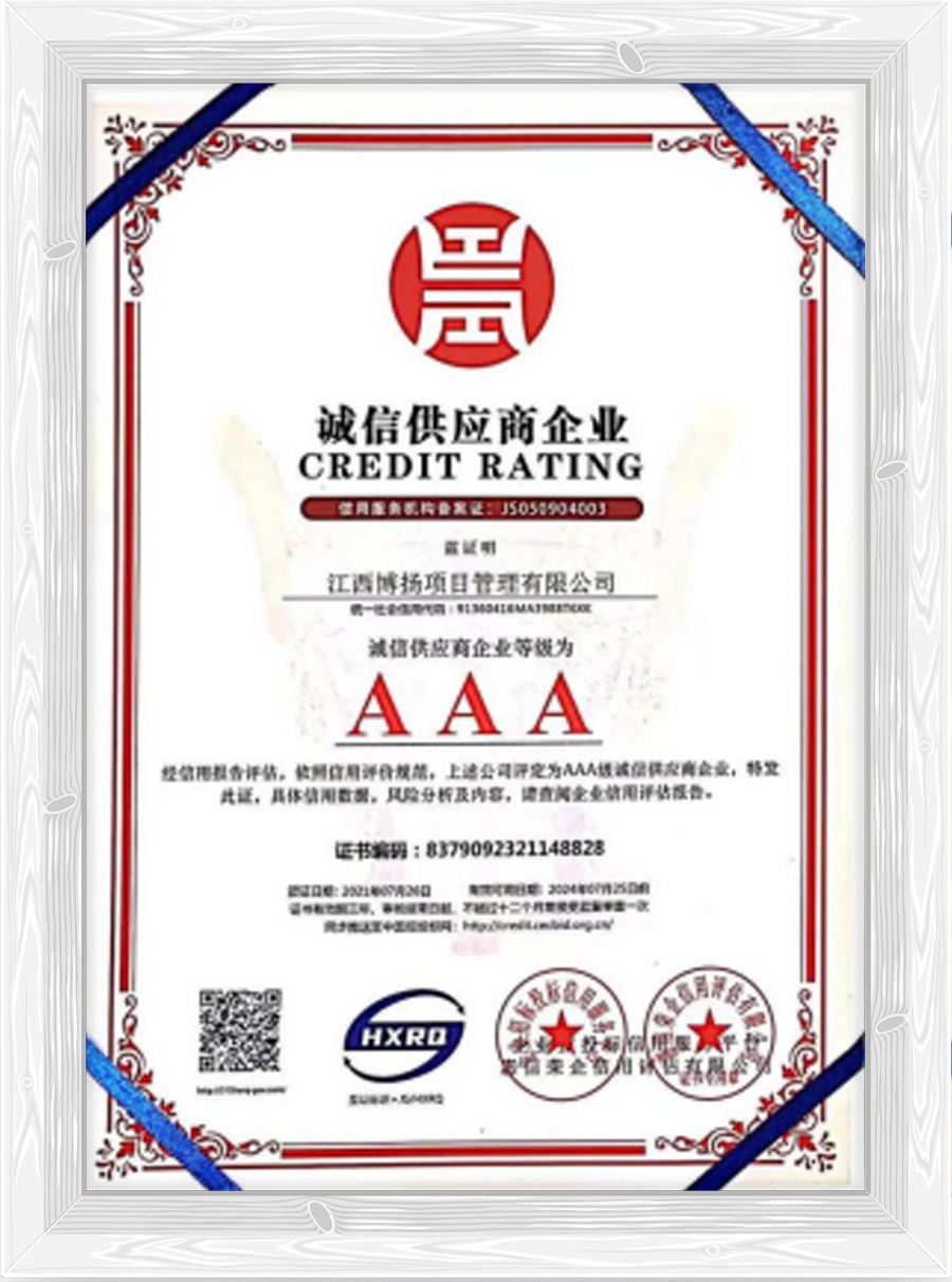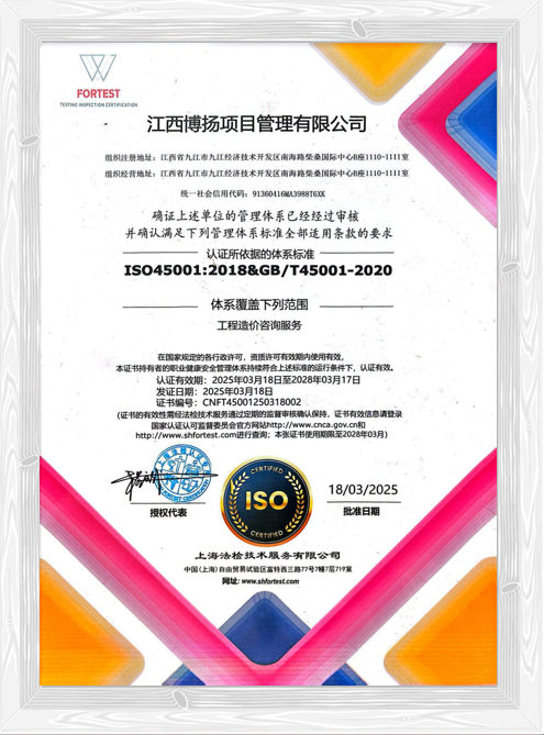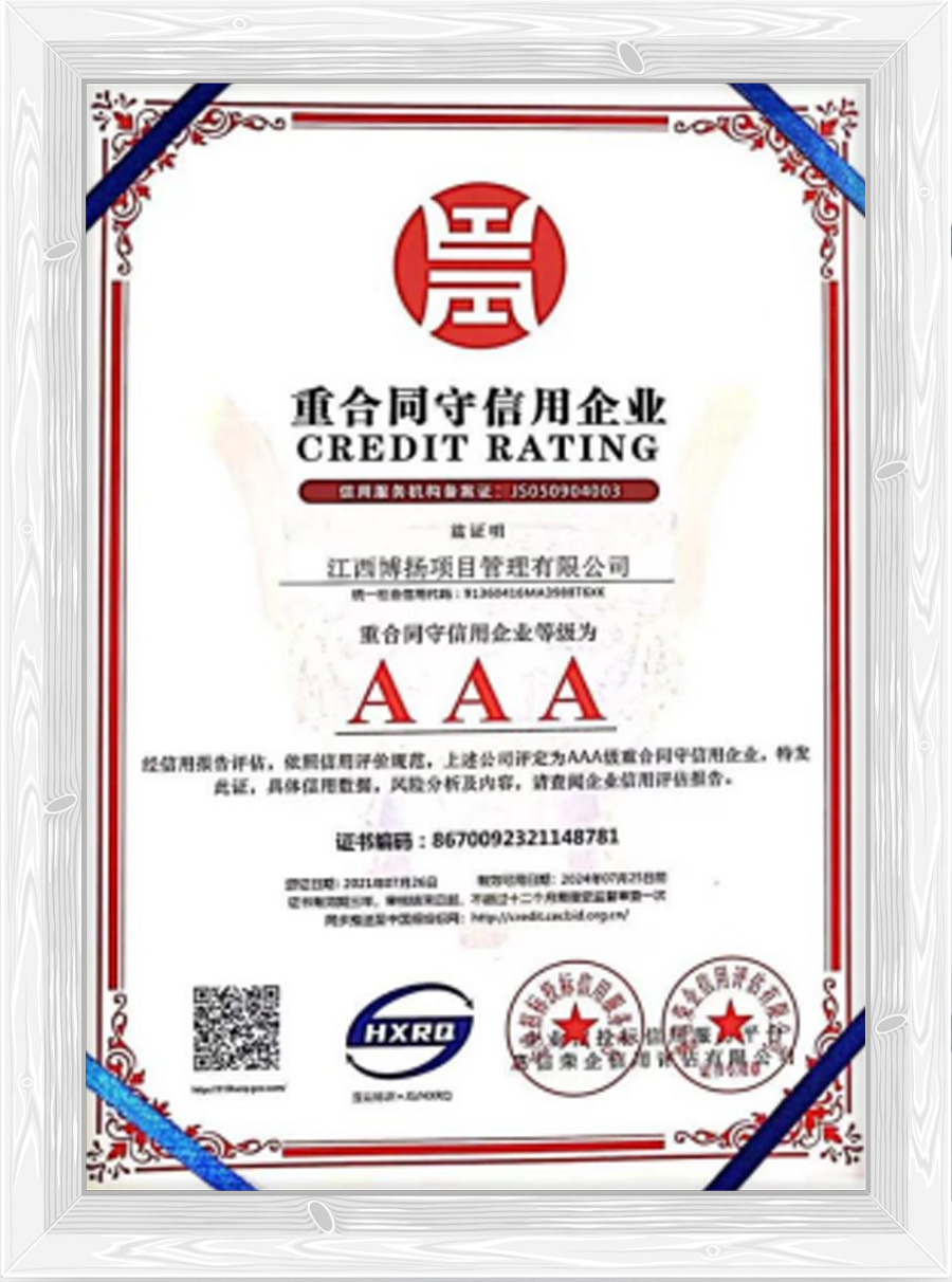 江西博扬项目管理有限公司成立于 2020 年 5 月,专门从事工程造价咨询、工程监理、招标代理、政府采购等业务的中介服务机构,业务上接受江西省建设厅,江西省建设工程造价管理站,江西省造价协会等部门的指导和监督。公司目前具备工程造价咨询乙级资质、房屋建筑及市政公用工程监理乙级资质;匹配了专业技术运用软件和硬件,同时建立了完善的组织架构和健全的管理制度体系,并获取了ISO三体系认证(质量管理体系认证、职业健康安全管理体系认证、环境管理体系认证)。