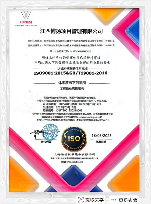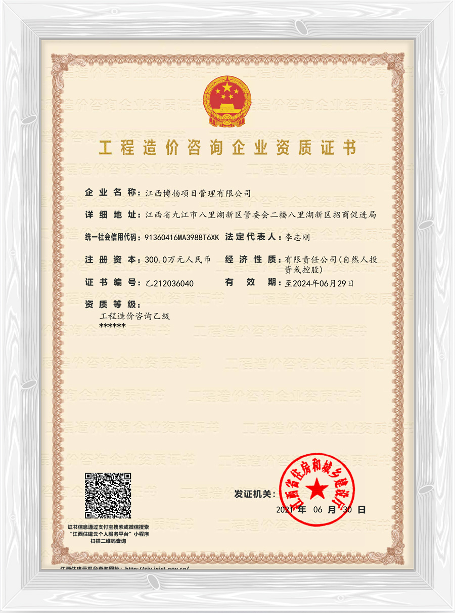 我公司作为江西省网上中介服务超市入驻单位、第一批入驻九江市财政局投资评审的入库单位,并在九江市各区、县财政局及审计局投资评审库中(其中包括:九江市财政局、濂溪区财政局、九江经开区财政局、八里湖新区财政金融服务中心、庐山市财政局、瑞昌市财政局、浔阳区财政局、都昌县财政局、柴桑区财政局、彭泽县财政局、湖口县财政局、修水县财政局、永修县财政局、红谷滩财政局、鄱阳县财政局、上饶市本级财政局、上饶市信州区财政局、鹰潭市月湖区财政局;九江市审计局、瑞昌市审计局、庐山市审计局、湖口县审计局、永修县审计局、修水县审计局、柴桑区审计局、共青城市审计局、德安县审计局)。博扬创建以来用科学发展、不断开拓创新的服务理念,打造出一支高素质,全方位复合型的人才队伍,形成具有专业程序和质量控制体系,树立企业的品牌,赢得了各委托方的广泛赞誉,在工程造价咨询服务行业享有良好口碑.....查看详情查看详情