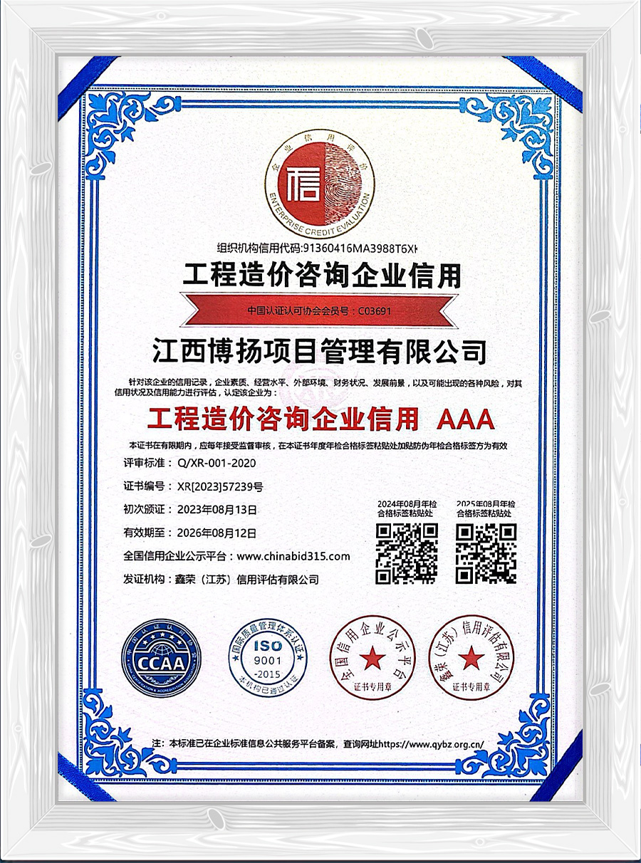 我公司作为江西省网上中介服务超市入驻单位、第一批入驻九江市财政局投资评审的入库单位,并在九江市各区、县财政局及审计局投资评审库中(其中包括:九江市财政局、濂溪区财政局、九江经开区财政局、八里湖新区财政金融服务中心、庐山市财政局、瑞昌市财政局、浔阳区财政局、都昌县财政局、柴桑区财政局、彭泽县财政局、湖口县财政局、修水县财政局、永修县财政局、红谷滩财政局、鄱阳县财政局、上饶市本级财政局、上饶市信州区财政局、鹰潭市月湖区财政局;九江市审计局、瑞昌市审计局、庐山市审计局、湖口县审计局、永修县审计局、修水县审计局、柴桑区审计局、共青城市审计局、德安县审计局)。博扬创建以来用科学发展、不断开拓创新的服务理念,打造出一支高素质,全方位复合型的人才队伍,形成具有专业程序和质量控制体系,树立企业的品牌,赢得了各委托方的广泛赞誉,在工程造价咨询服务行业享有良好口碑.....查看详情查看详情