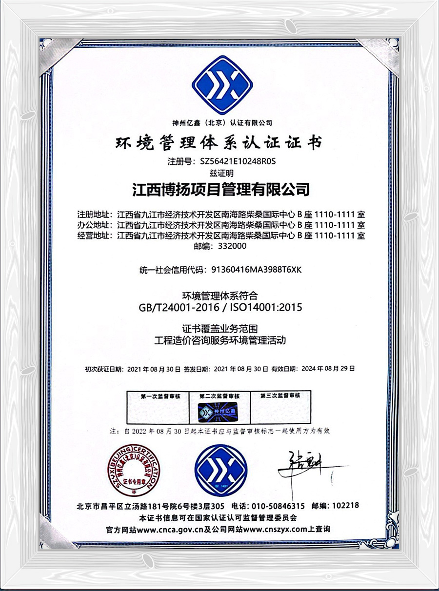 江西博扬项目管理有限公司成立于 2020 年 5 月,专门从事工程造价咨询、工程监理、招标代理、政府采购等业务的中介服务机构,业务上接受江西省建设厅,江西省建设工程造价管理站,江西省造价协会等部门的指导和监督。公司目前具备工程造价咨询乙级资质、房屋建筑及市政公用工程监理乙级资质;匹配了专业技术运用软件和硬件,同时建立了完善的组织架构和健全的管理制度体系,并获取了ISO三体系认证(质量管理体系认证、职业健康安全管理体系认证、环境管理体系认证)。